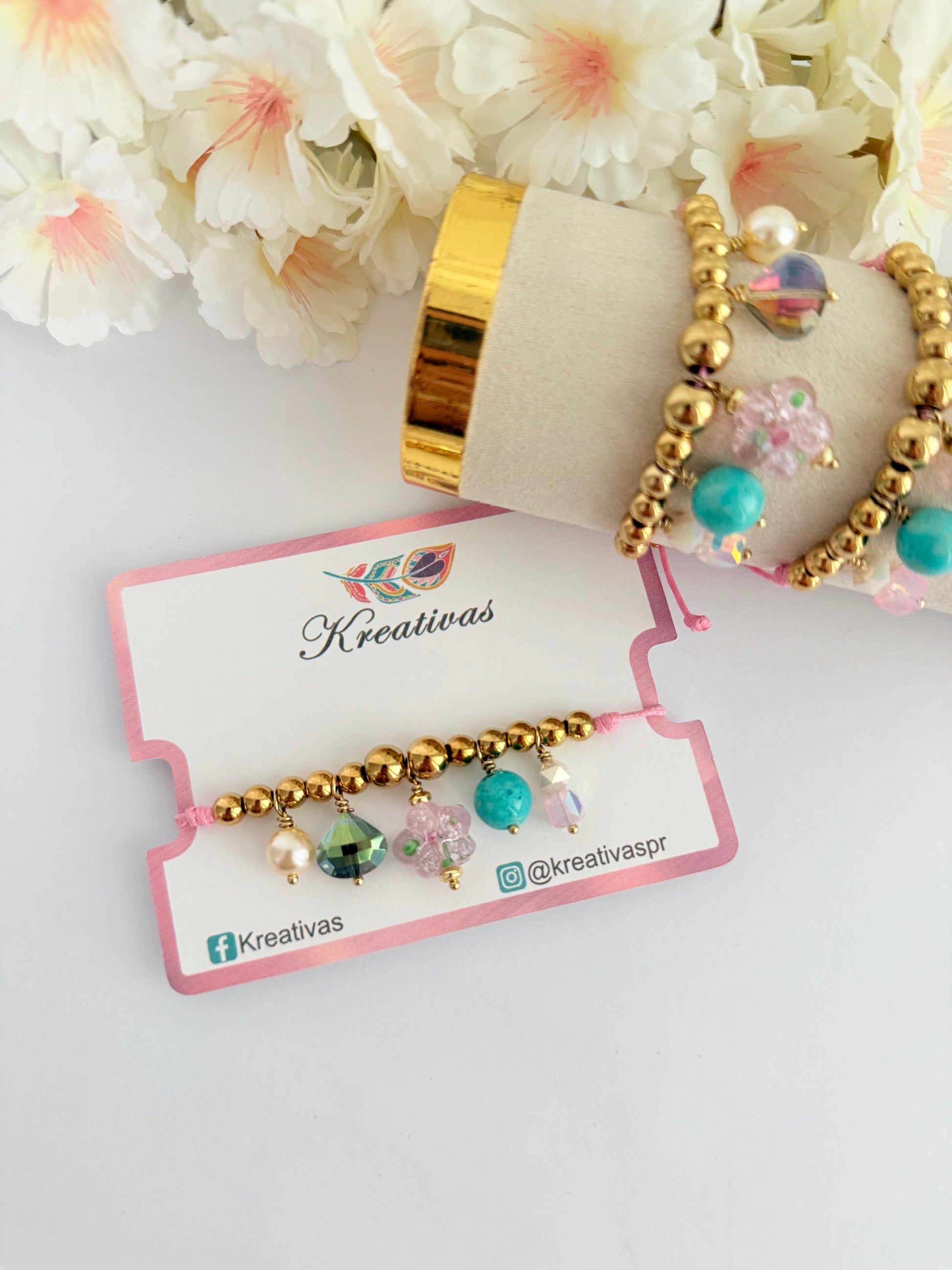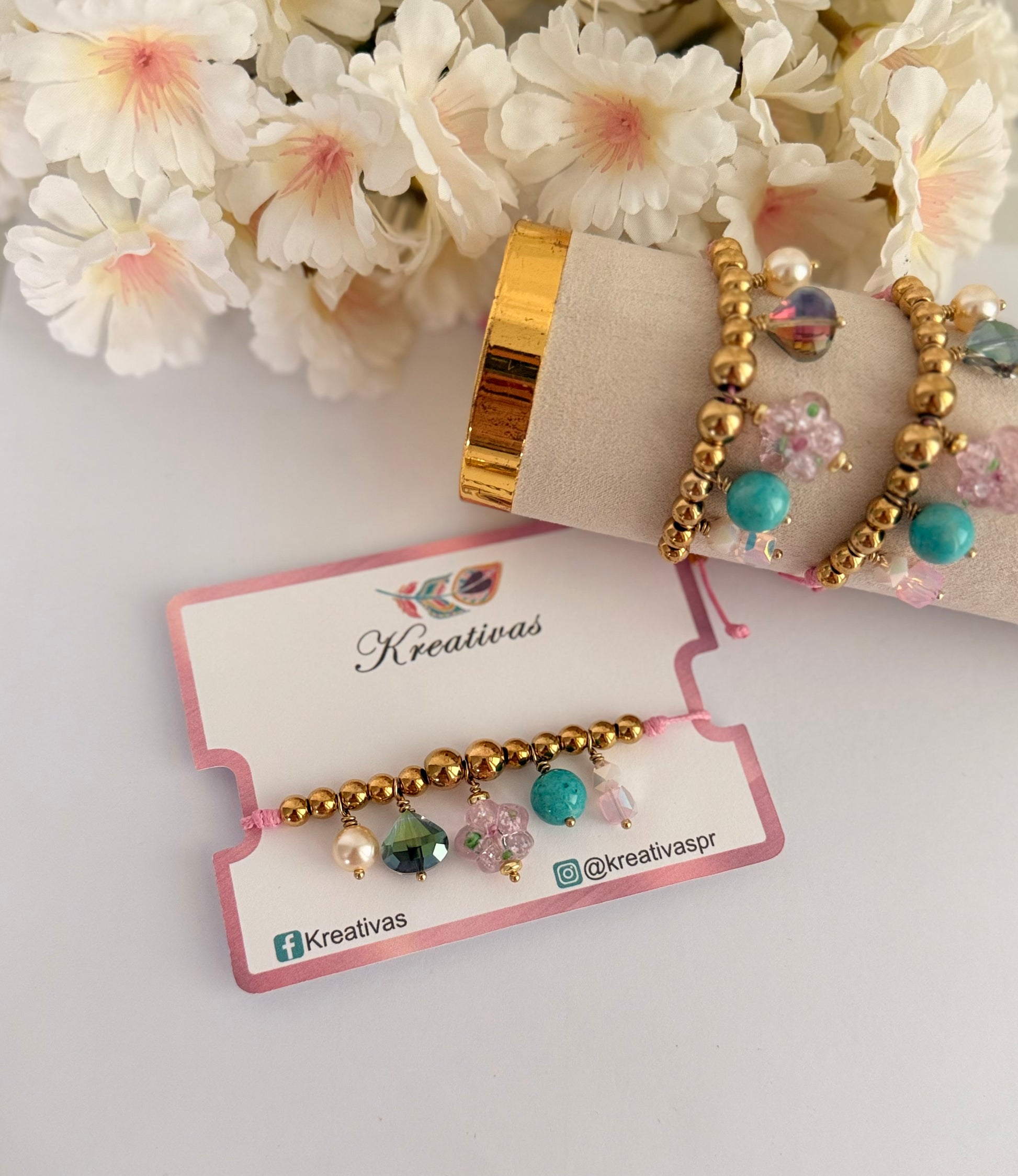 Ajustable en hilo, charms en cristales y baño en oro 18k. También disponible en collar.