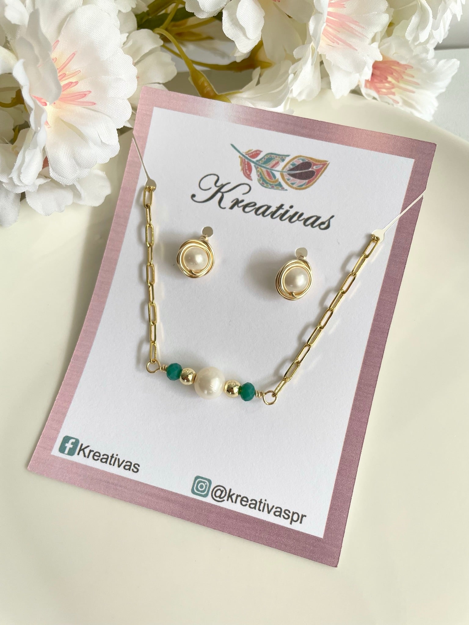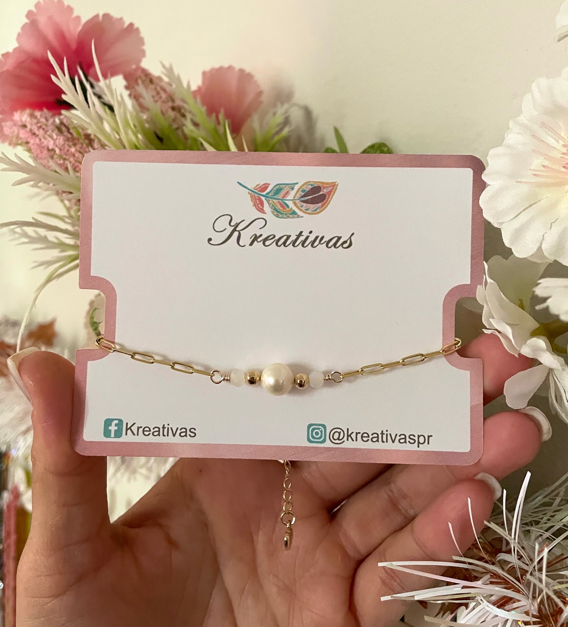 Material: cadena con baño en oro 18K, perla cultivada, cristales y hematites