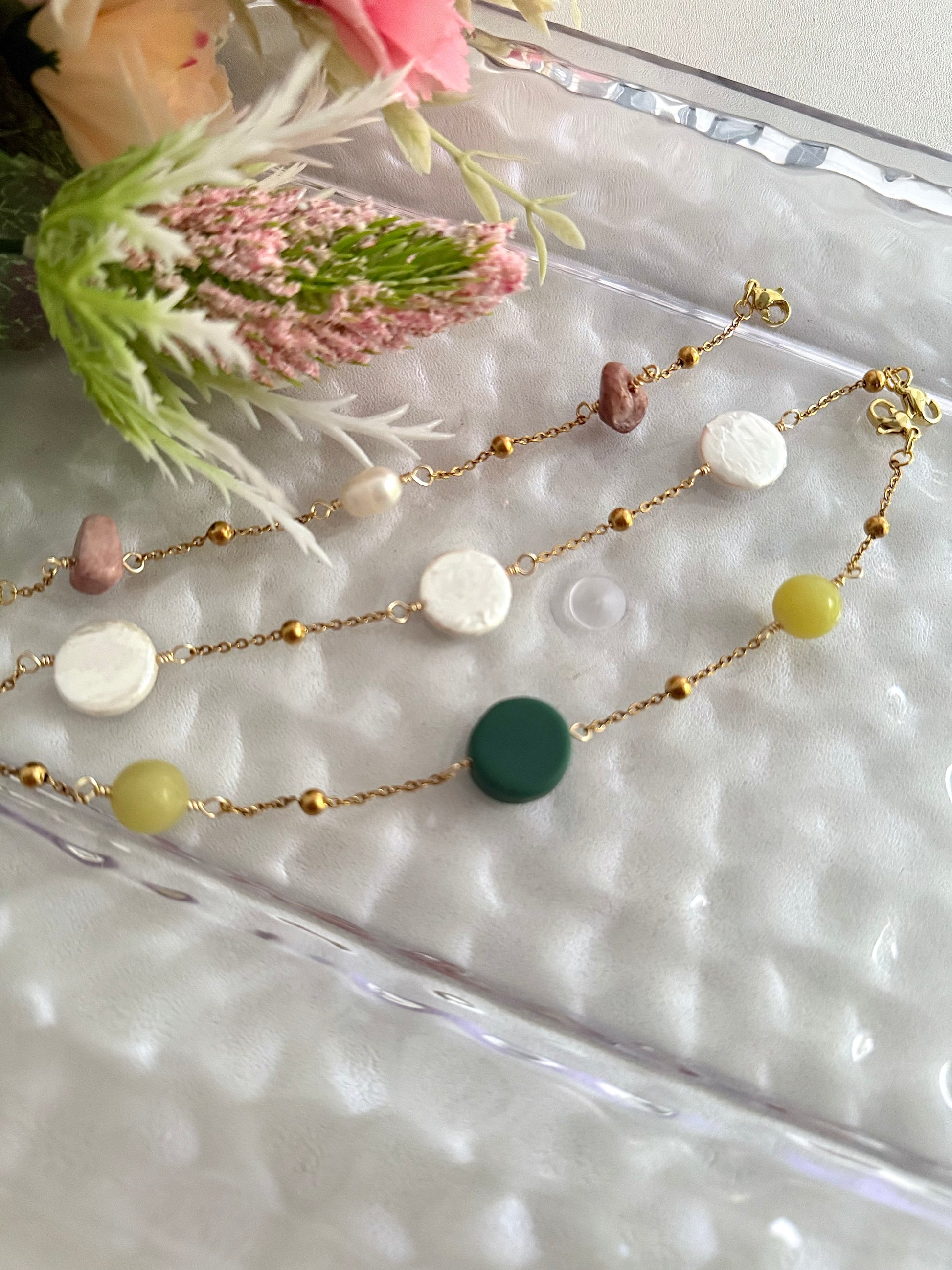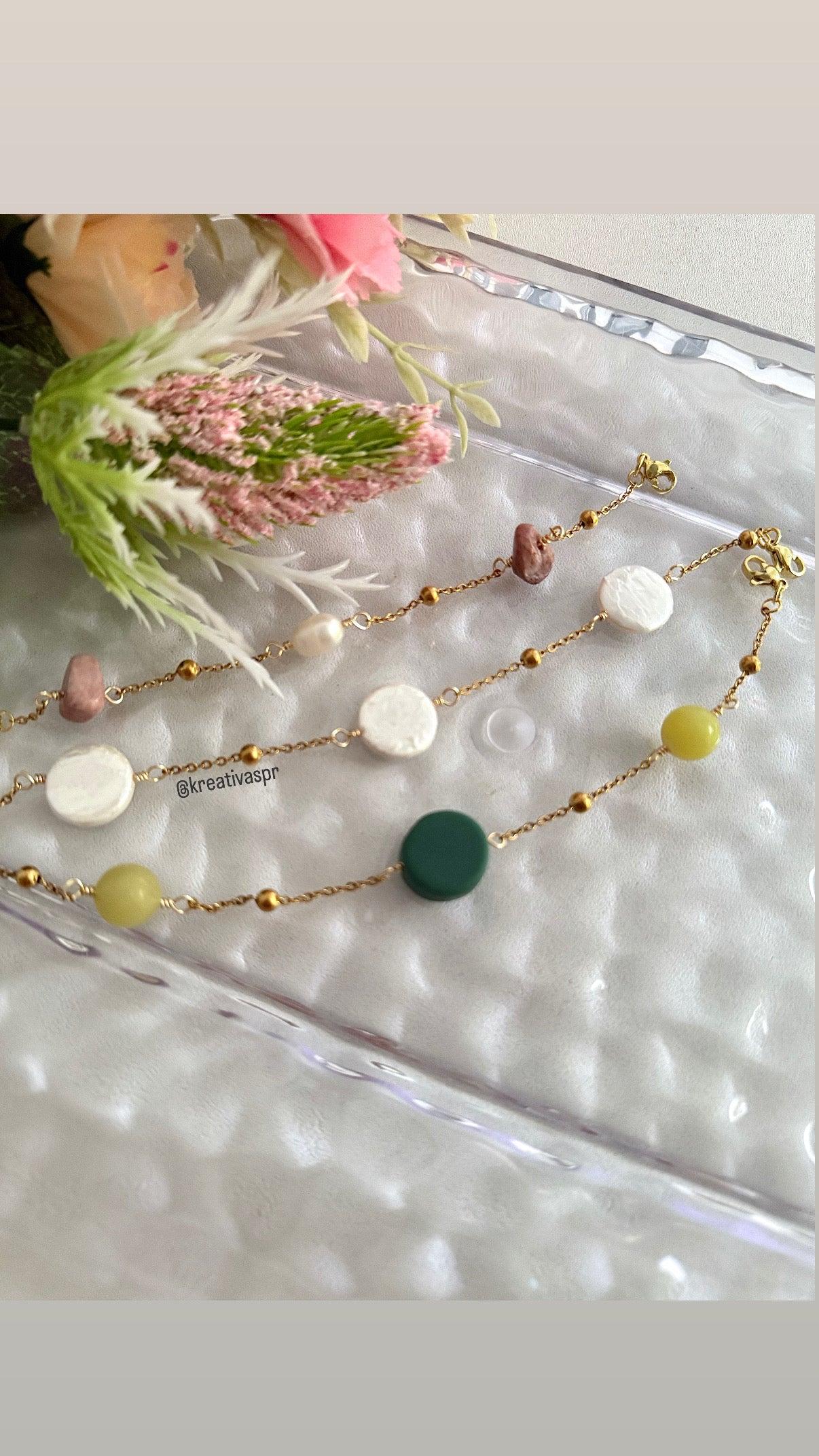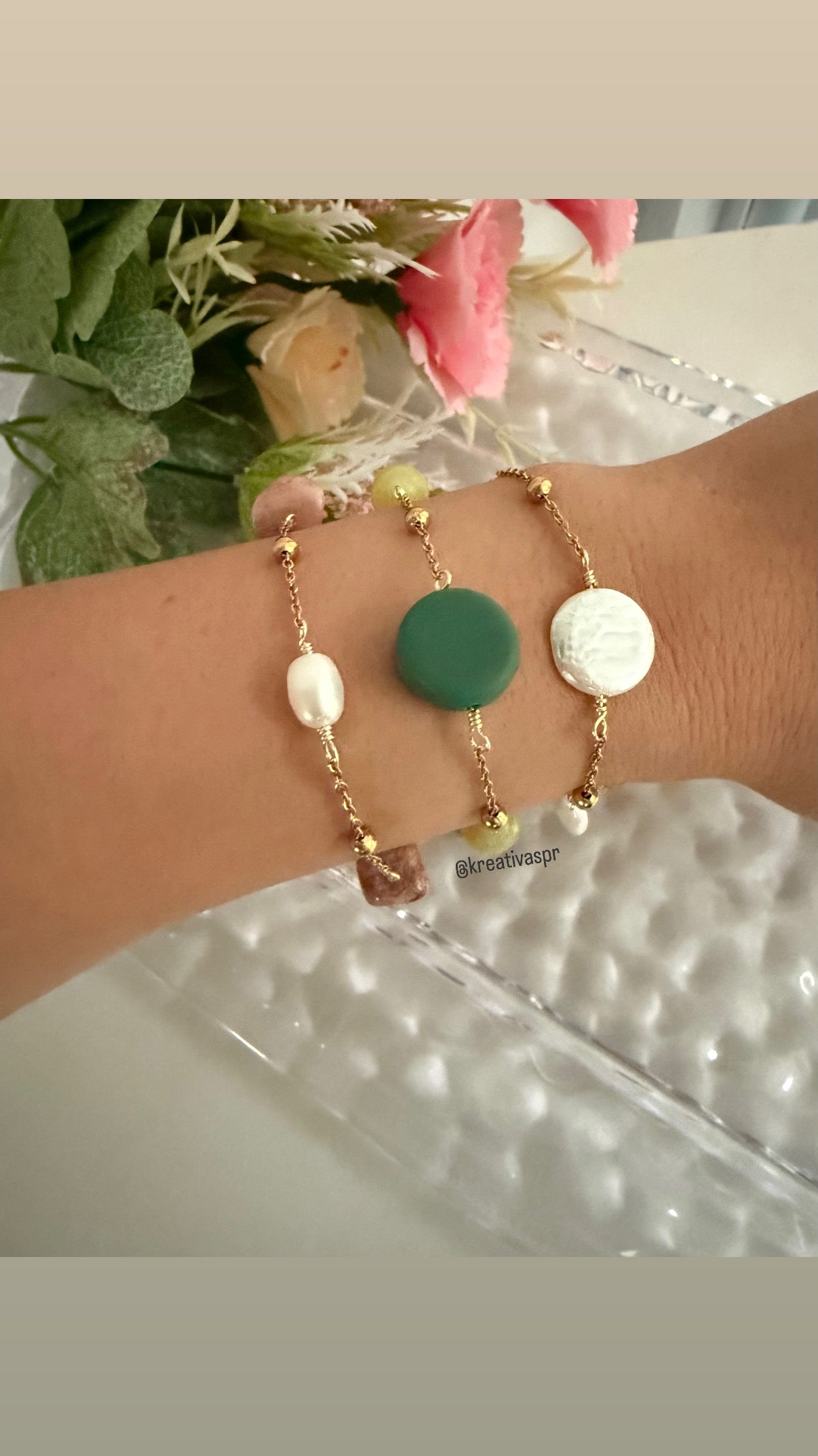 Una delicada pulsera de piedras semipreciosas, perlas y resina alambrados a mano. Su cadena en stainless steel la hace duradera y versátil, además de hermosa.