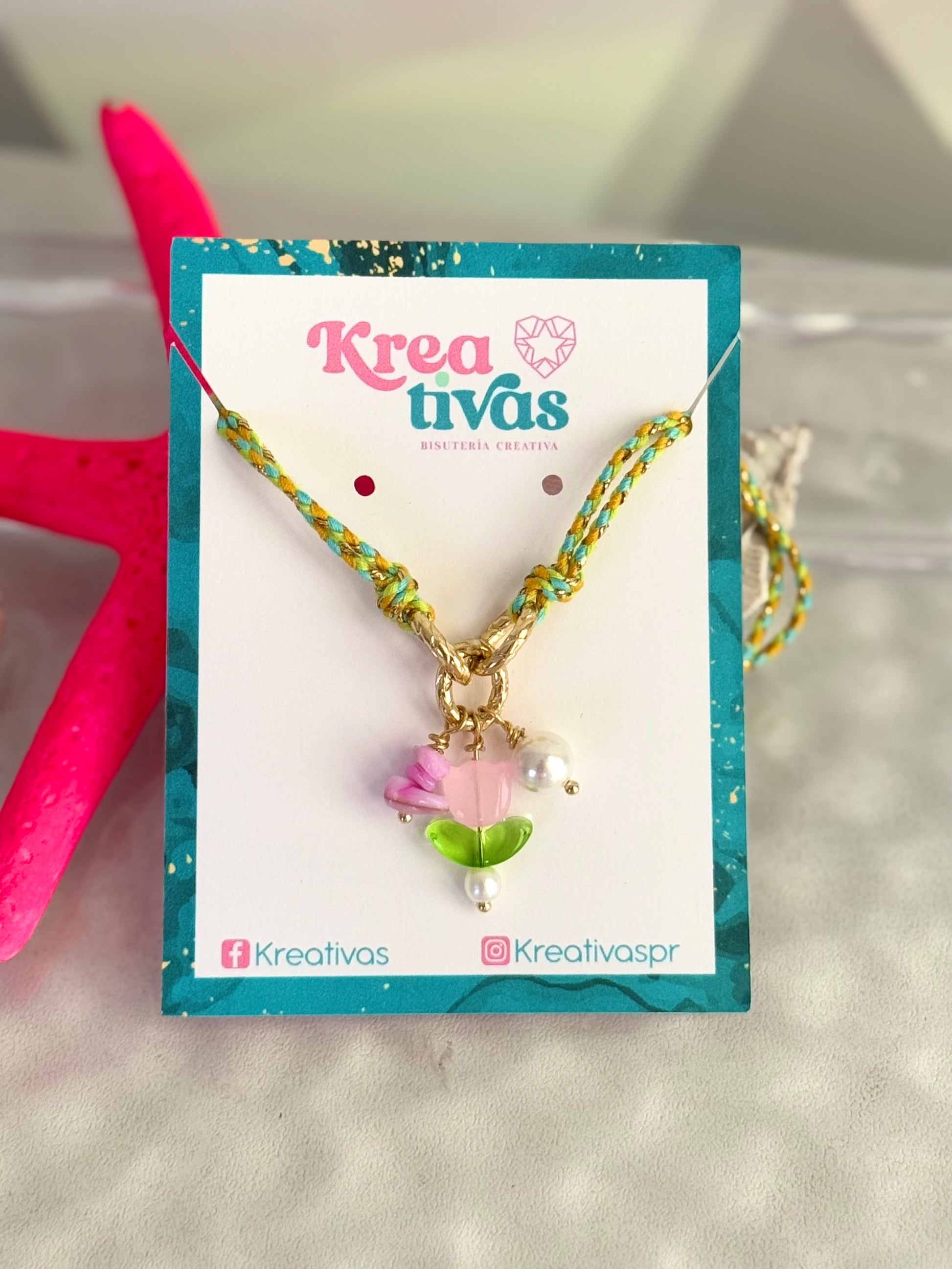 Pulsera en hilo ajustable con detalles en stainless steel, cristales y perlas