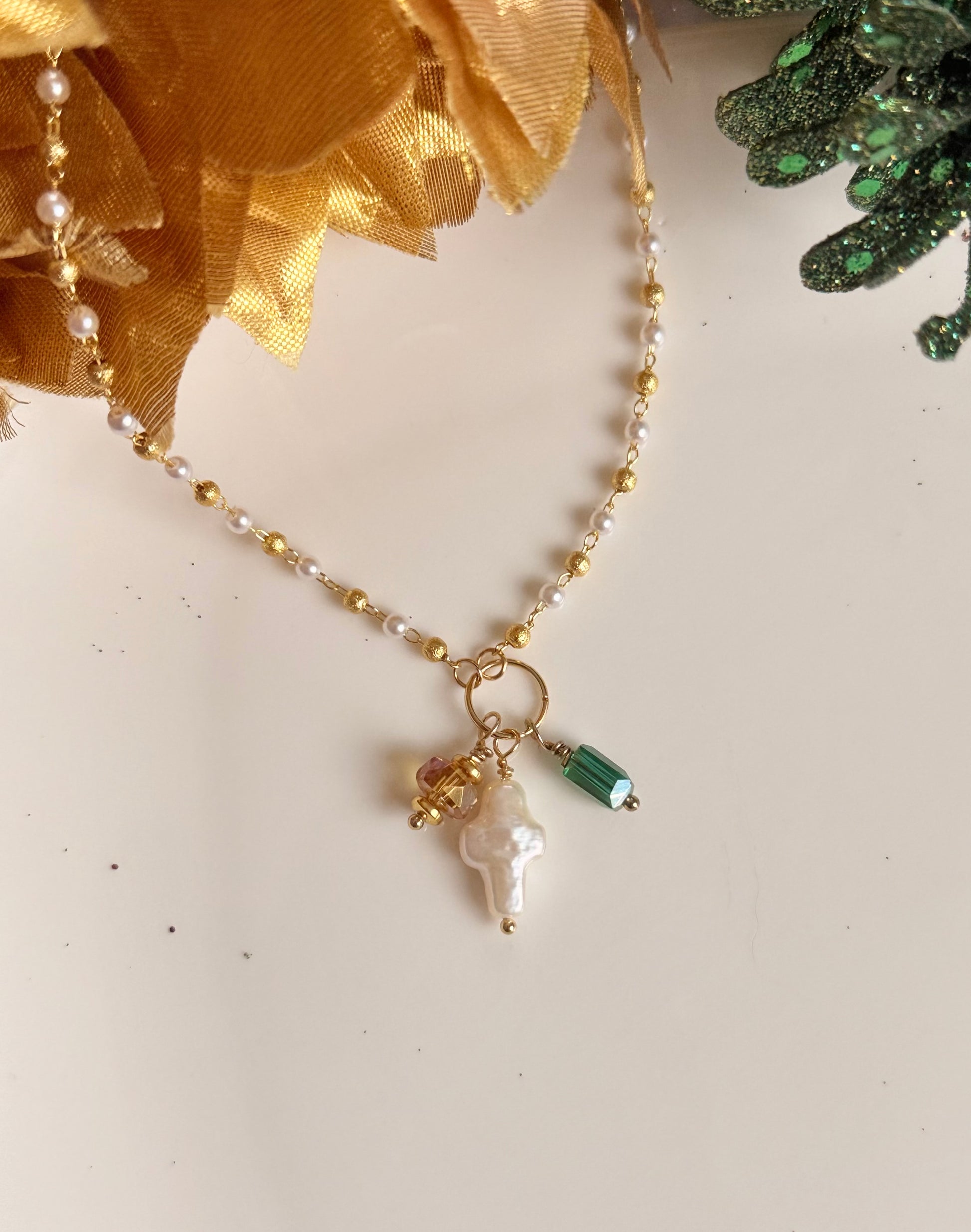 Cadena con enchape de larga duración y charms en perla cultivada, cristales y stainless steel.