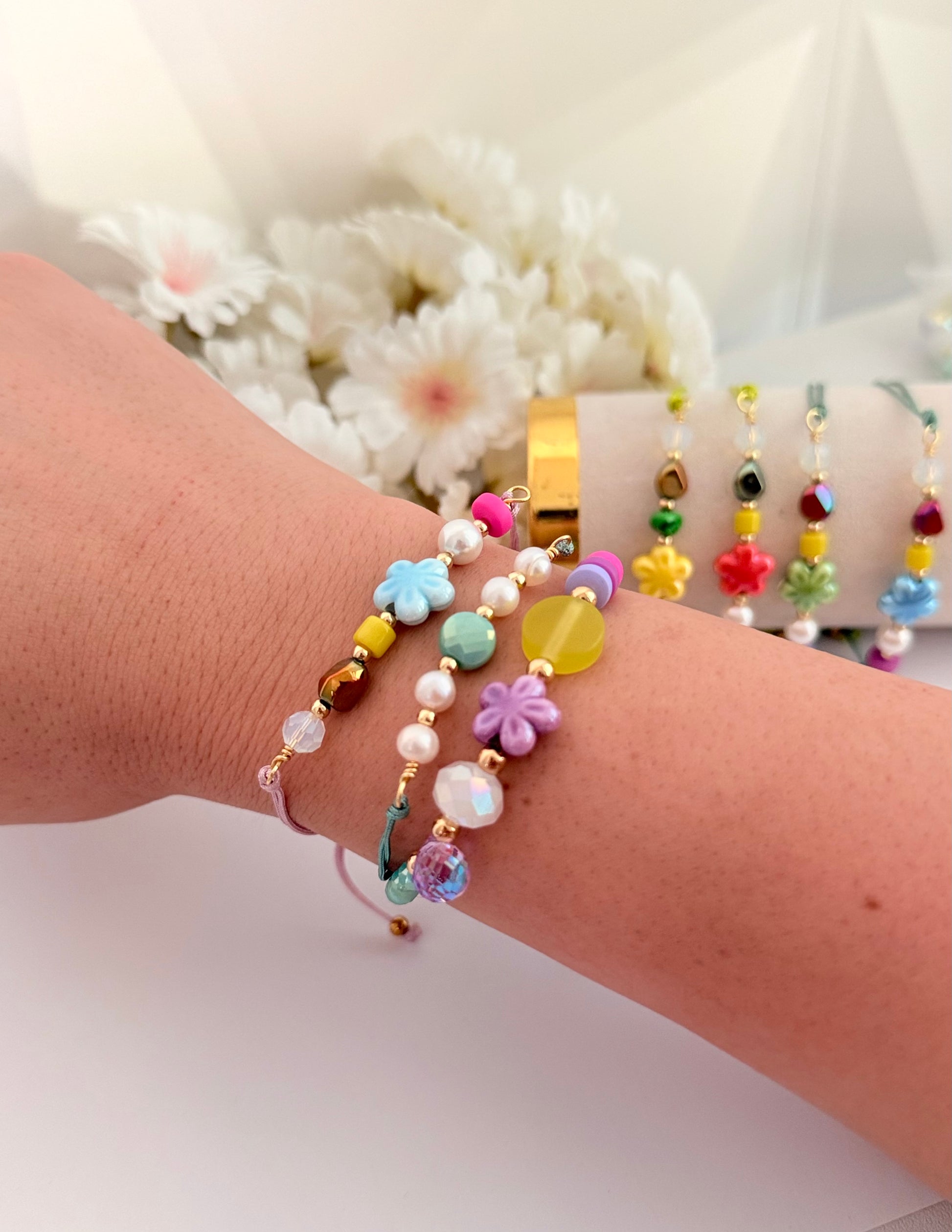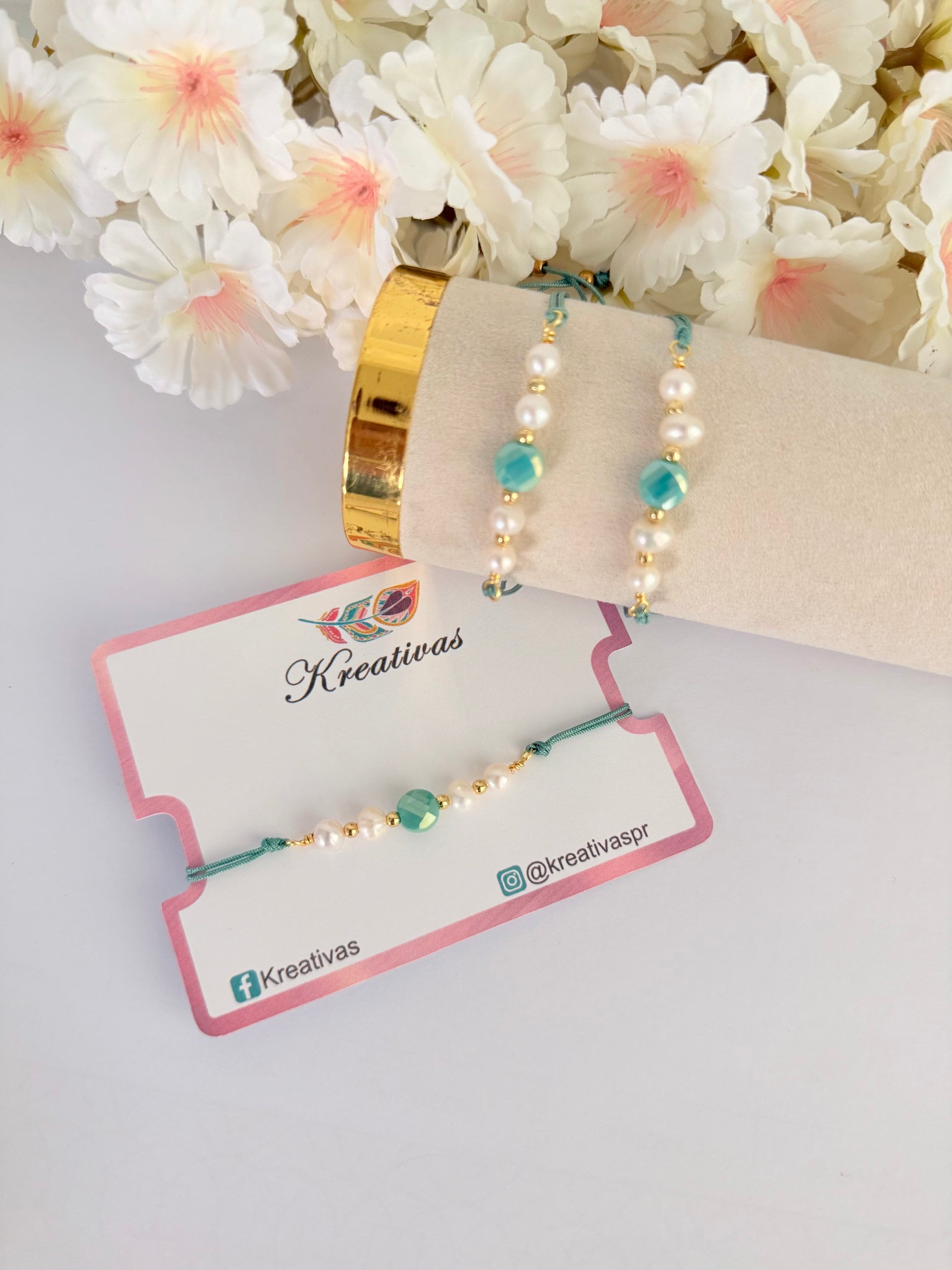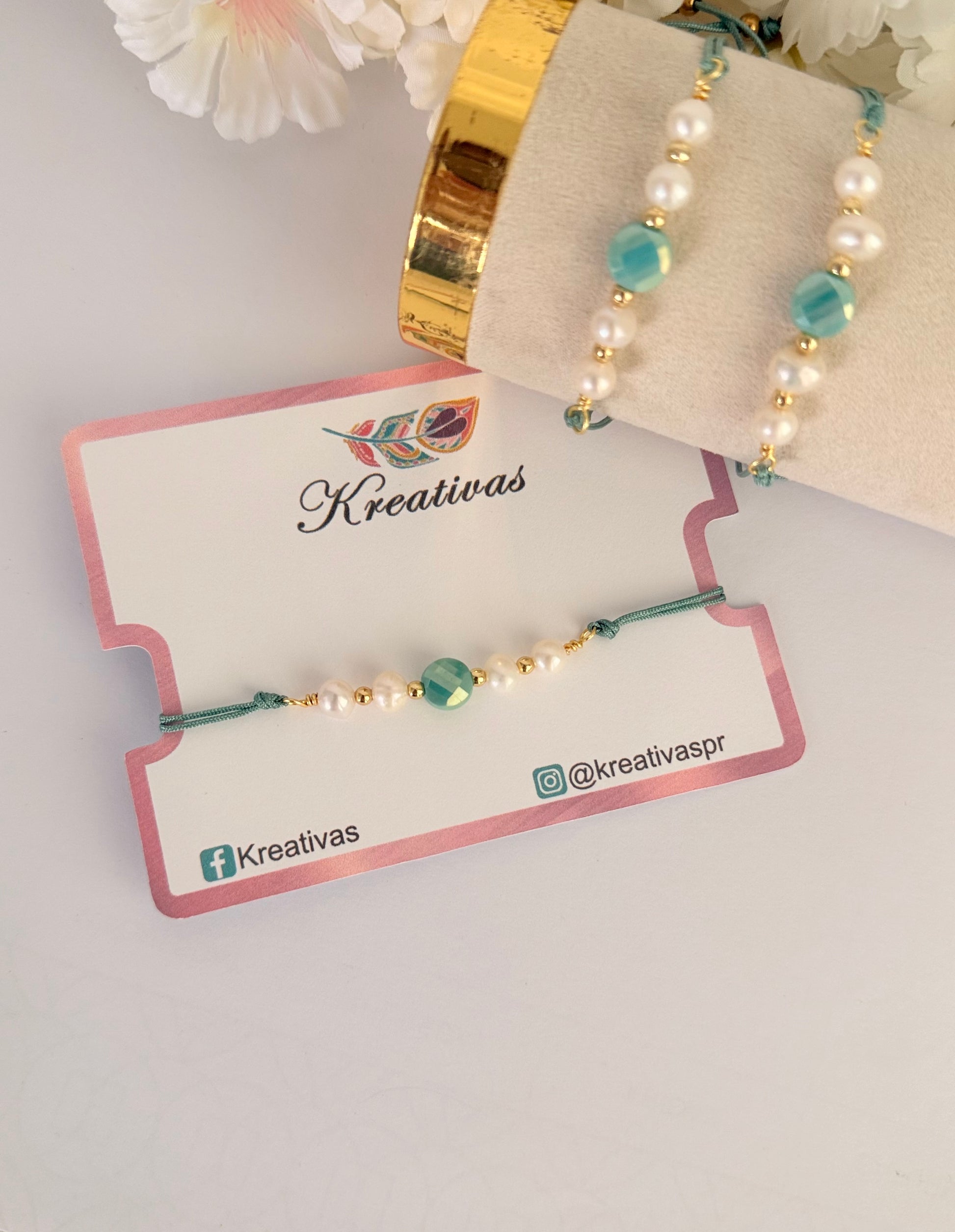 Pulsera en hilo ajustable con cristales alambrados a mano y baño en oro 18k.